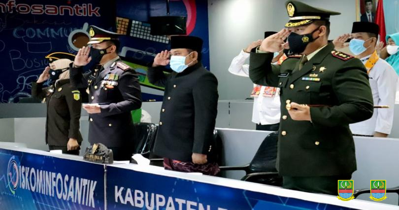 CIKARANG PUSAT – Bupati Bekasi Eka Supria Atmaja bersama jajaran Forkopimda menghadiri upacara peringatan Hari Lahir Pancasila tingkat nasional secara virtual bertempat di Ruang Command Center Gedung Diskominfosantik Komplek Pemkab Bekasi, Cikarang Pusat, pada Selasa (1/06/2021) .